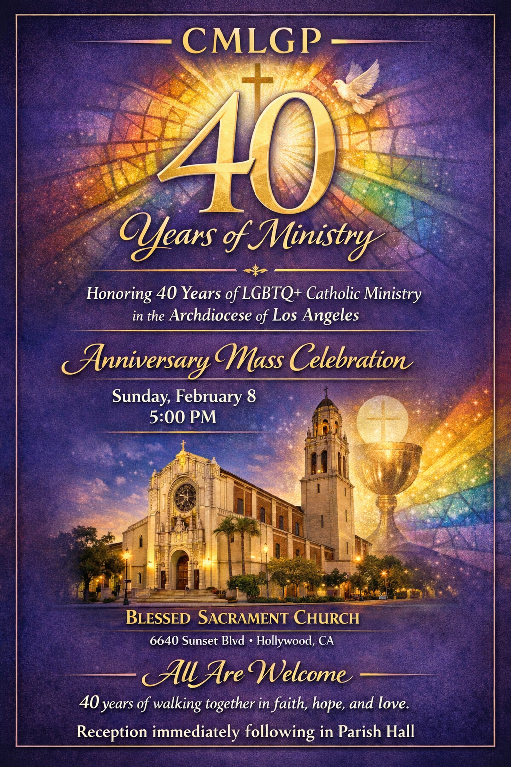 This year Comunidad and our Catholic Ministry with Lesbian and Gay+ Persons (CMLGP) celebrates its 40th Anniversary! On Sunday, February 8th, we return to Blessed Sacrament Church in Hollywood (6657 Sunset Blvd, Los Angeles, CA 90028) at 5PM for Mass. It was there that then Archbishop now Cardinal Roger Mahoney initiated our ministry. Our then pastor, Fr. Gerry Meisel, was the first accept the Cardinal’s invitation to host our ministry and Comunidad was born. We will have signups at our first Tuesday January and February monthly meetings for those who may wish to carpool to the event.