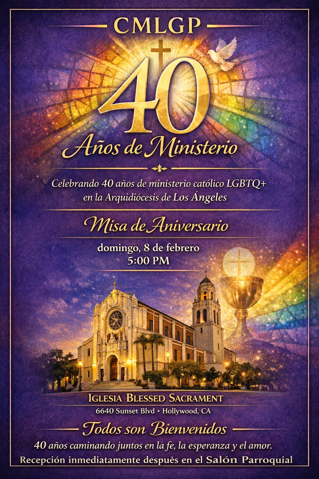 This year Comunidad and our Catholic Ministry with Lesbian and Gay+ Persons (CMLGP) celebrates its 40th Anniversary! On Sunday, February 8th, we return to Blessed Sacrament Church in Hollywood (6657 Sunset Blvd, Los Angeles, CA 90028) at 5PM for Mass. It was there that then Archbishop now Cardinal Roger Mahoney initiated our ministry. Our then pastor, Fr. Gerry Meisel, was the first accept the Cardinal’s invitation to host our ministry and Comunidad was born. We will have signups at our first Tuesday January and February monthly meetings for those who may wish to carpool to the event.
